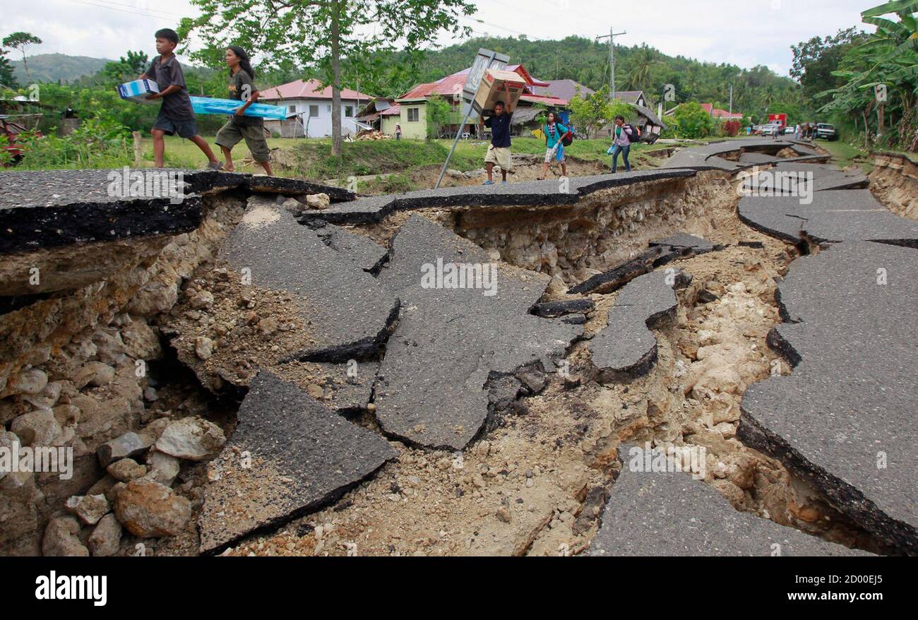 Residents Walk Along A Damaged Road Caused By An Earthquake In Guihulngan Negros Oriental In Central Philippines February 7 2012 Philippine Rescuers Searched On Tuesday For 29 Residents Of A Mountainside Community